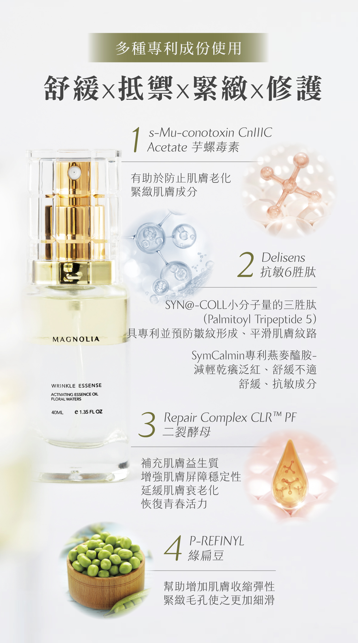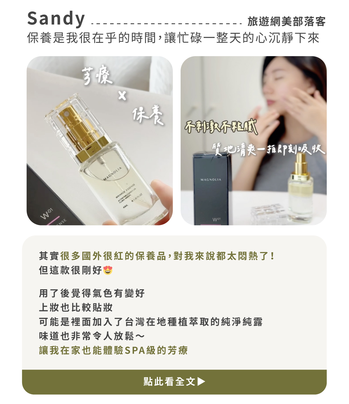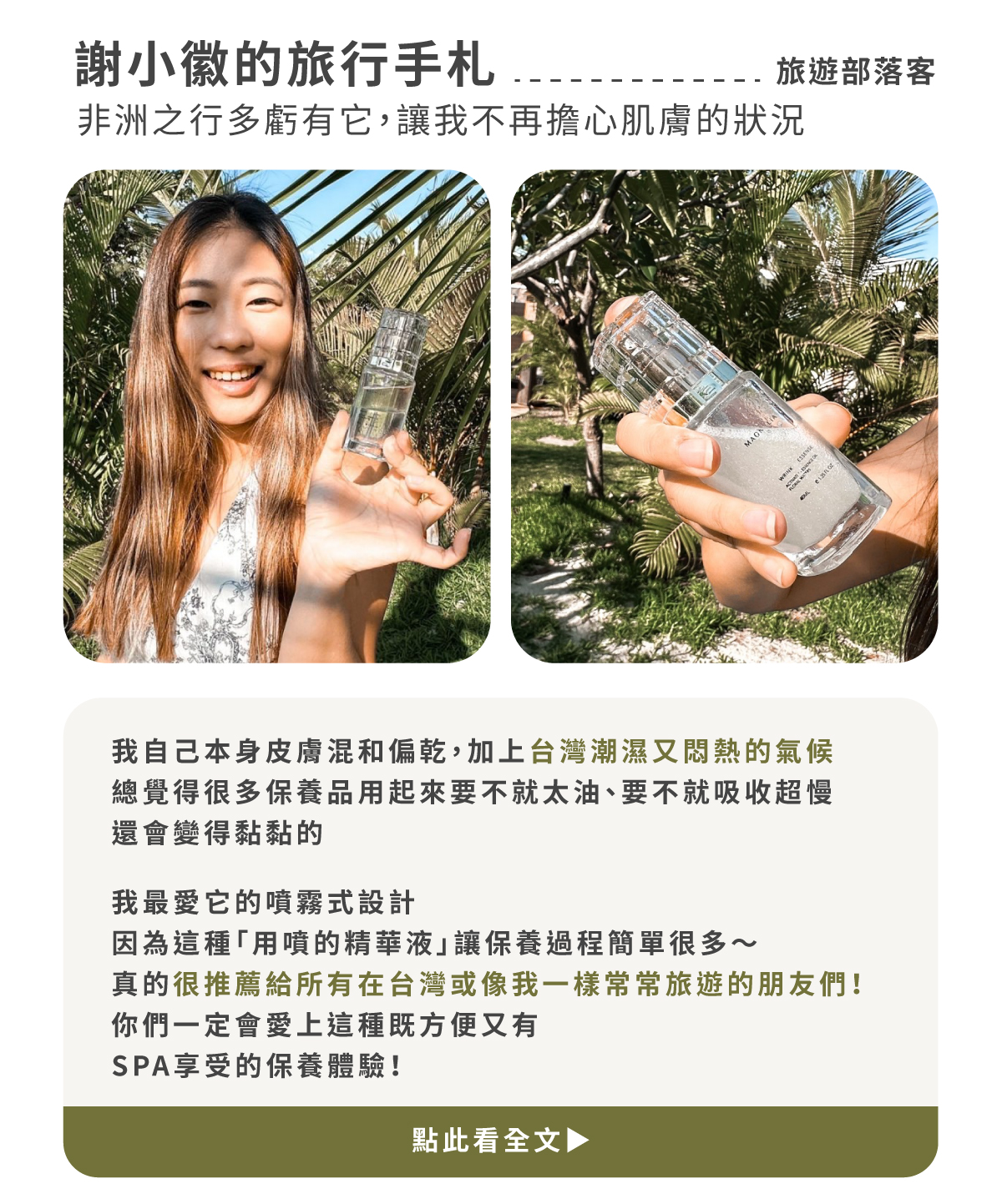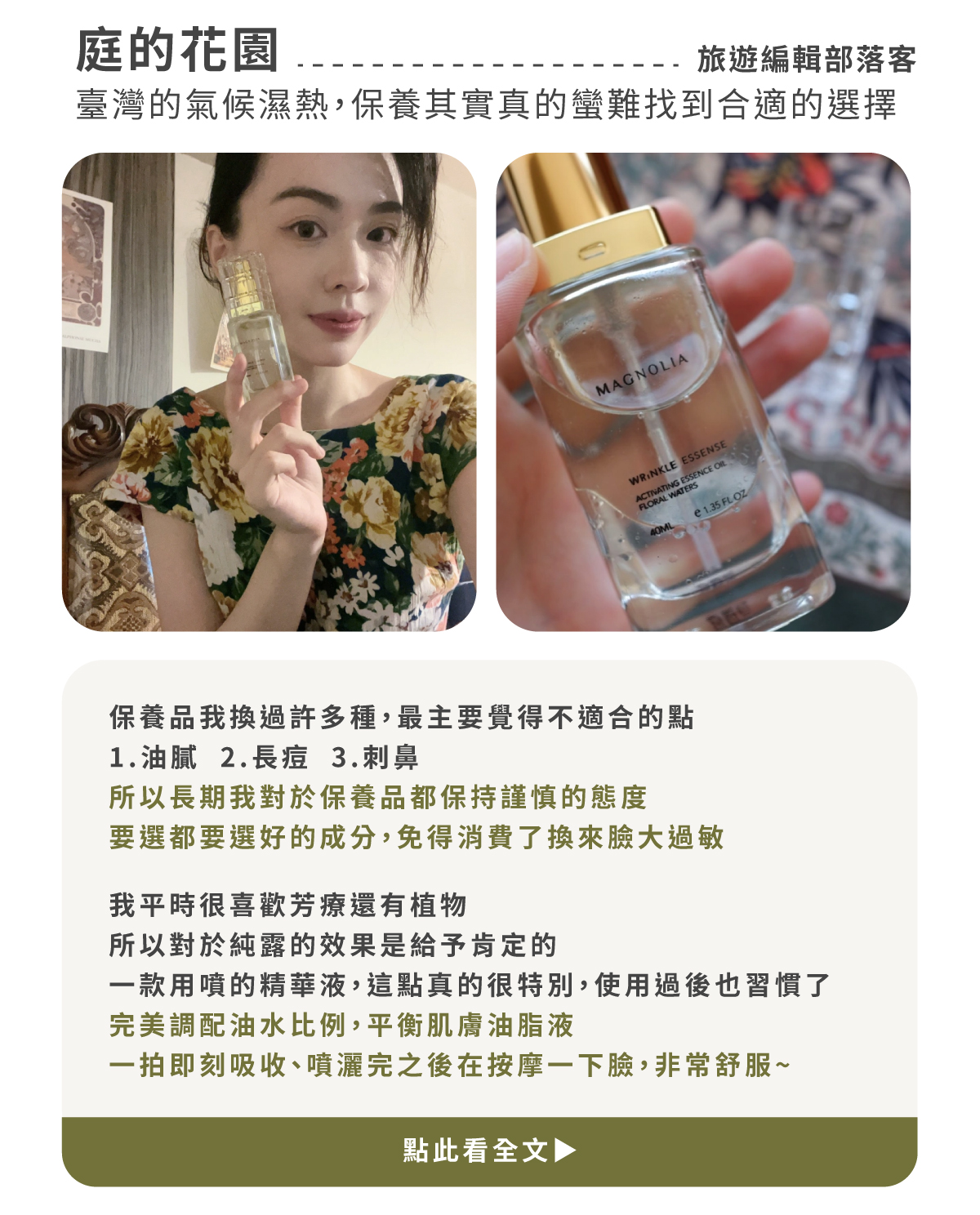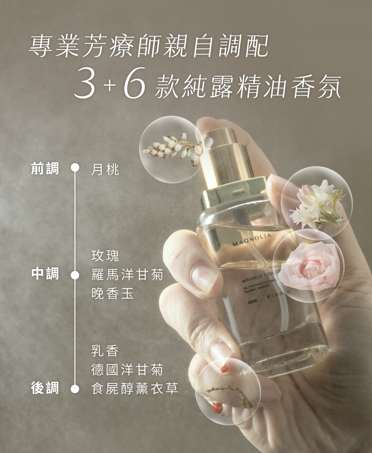 擁有加拿大國際芳療證照的十年經歷芳療師「魔女」,結合台灣在地種植天然精油純露及頂級煥活緊緻成分,打造出由內而外都兼顧保養的「精華露」。