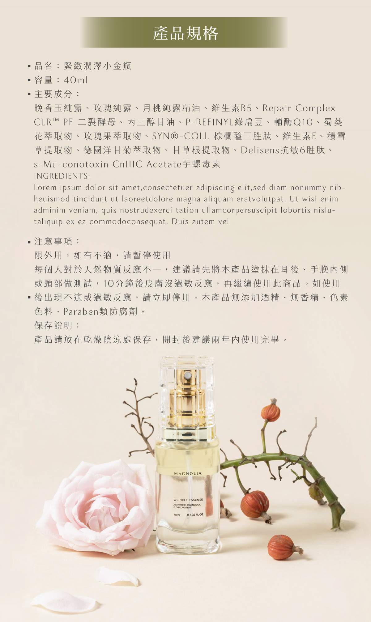 我們化繁為簡,把化妝水、乳液、精華液及保養油的步驟去蕪存菁,濃縮到這一罐「緊緻潤澤小金瓶」精華露裡,使用天然萃取的精油及純露所製造之保養品,帶你享受大自然的餽贈。