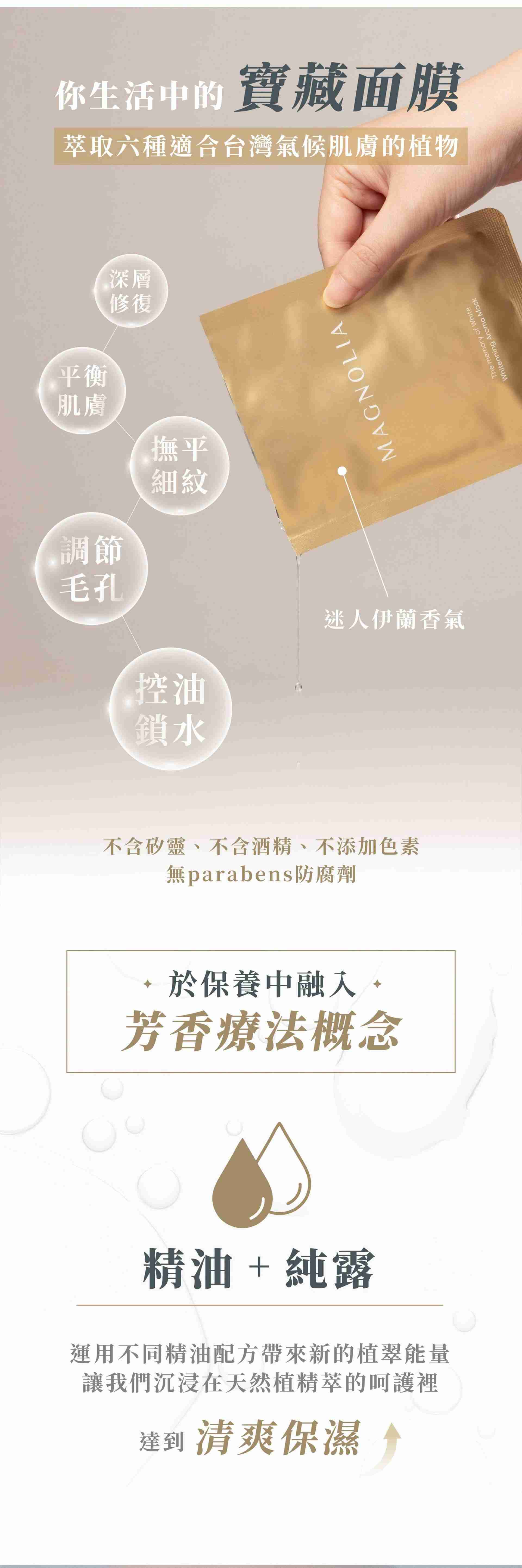 ● 多樣植物保留花草中的修護力,深層修護 、長效保濕、極致亮白; 一片多效有感